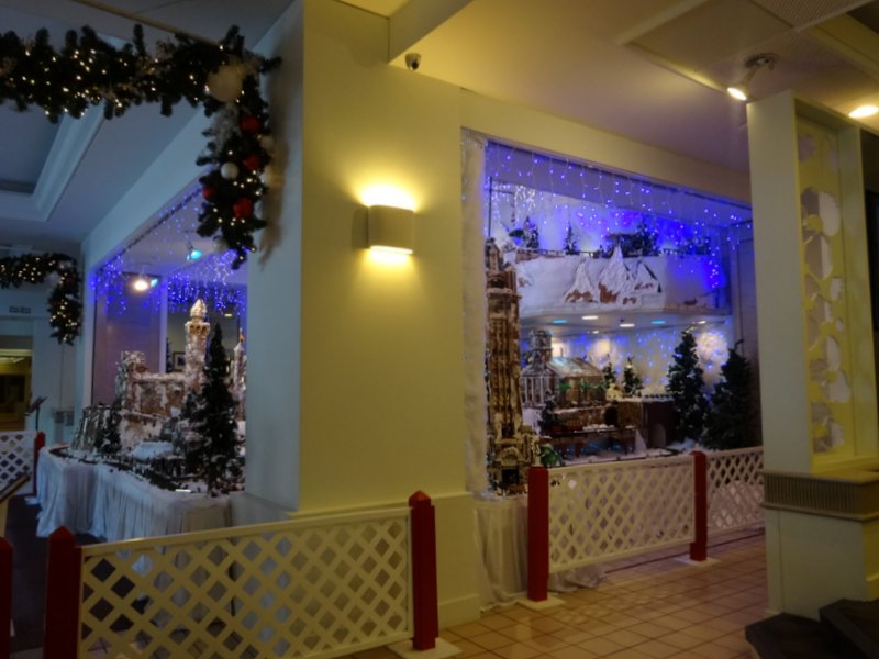 「シェラトン・プリンセス・カイウラニ・ホテル」の1階ロビーに展示されている恒例のジンジャ―ブレッド・ビレッジ(お菓子の国)。ジンジャーブレッド、ダーク・ホワイトのチョコレートなどを使った高さ約4.5メートル、幅約7メートルある「お菓子の国です!